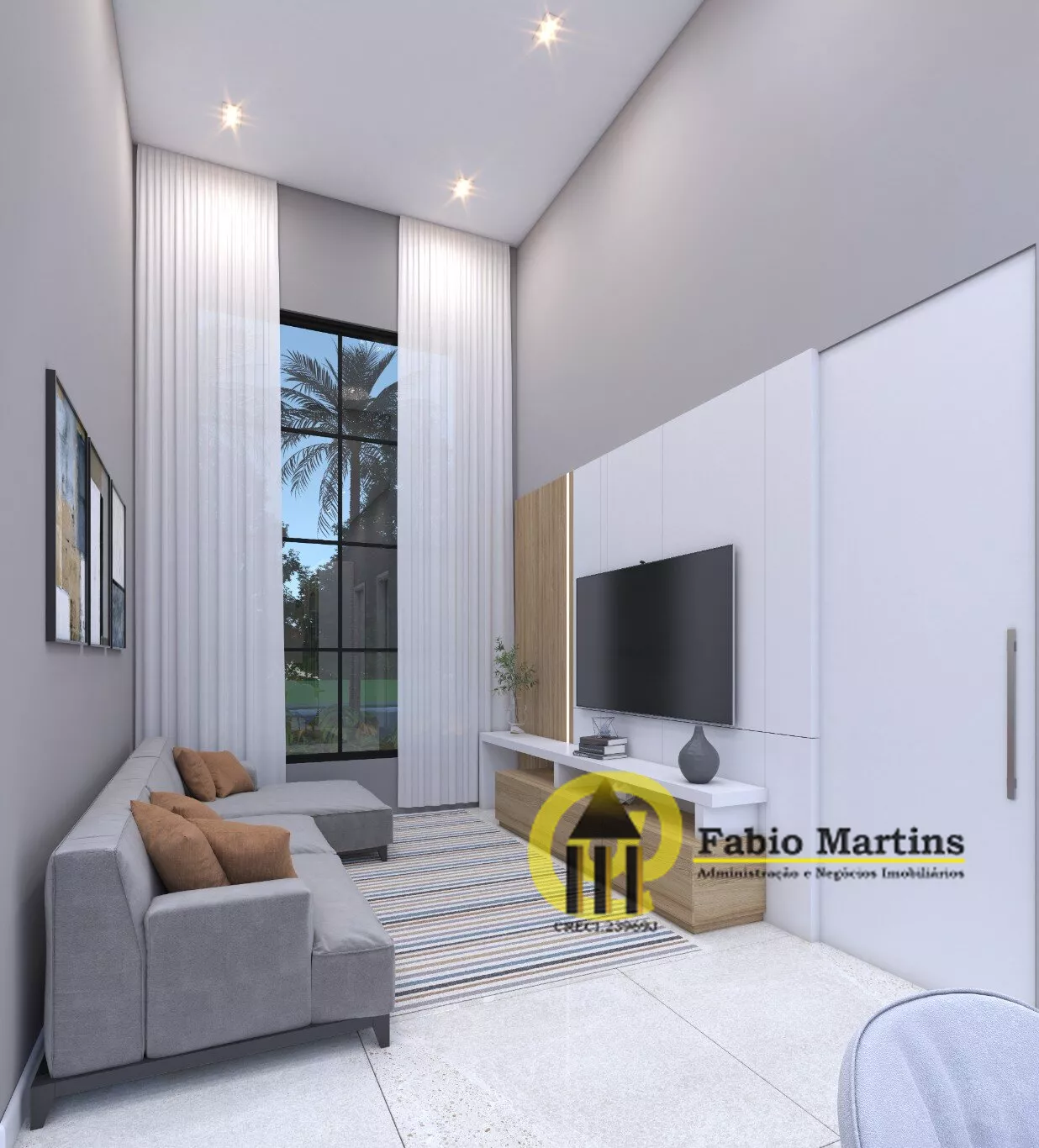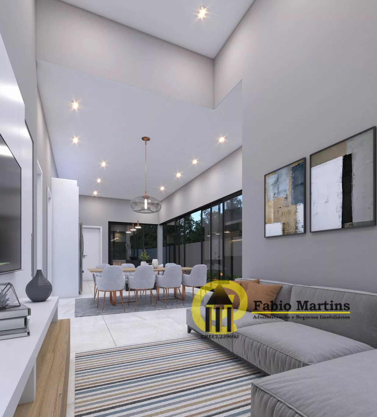 Sala com pé direito duplo, acabamento de altíssimo padrão, um verdadeiro luxo criando um ambiente acolhedor e sofisticado.